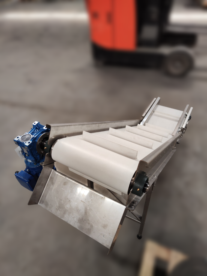Конвеєр виготовлено з нержавіючої сталі AISI 304, що гарантує стійкість до корозії, легке очищення та повну відповідність гігієнічним вимогам харчової промисловості. Стрічка Reveyron із перегородками 40 мм дбайливо транспортує продукцію без пошкоджень, а конструкція конвеєра забезпечує стабільність і довговічність навіть при інтенсивній експлуатації.