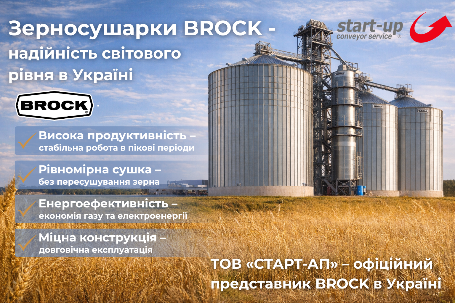 Зерносушарки BROCK у поєднанні з інженерною підтримкою START-UP Conveyor Service забезпечують аграрним підприємствам стабільність технологічних процесів та впевненість у кожному виробничому сезоні.