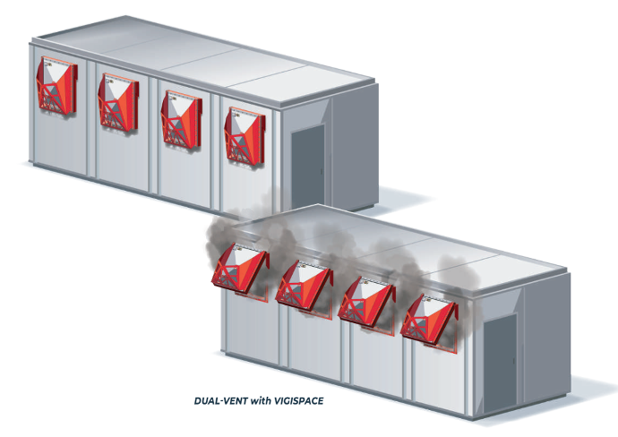 Інноваційне поєднання нашого рішення DUAL-VENT (відкриття з детекцією газу + вибухозахисна панель) з нашим сертифікованим дефлектором VIGISPACE.