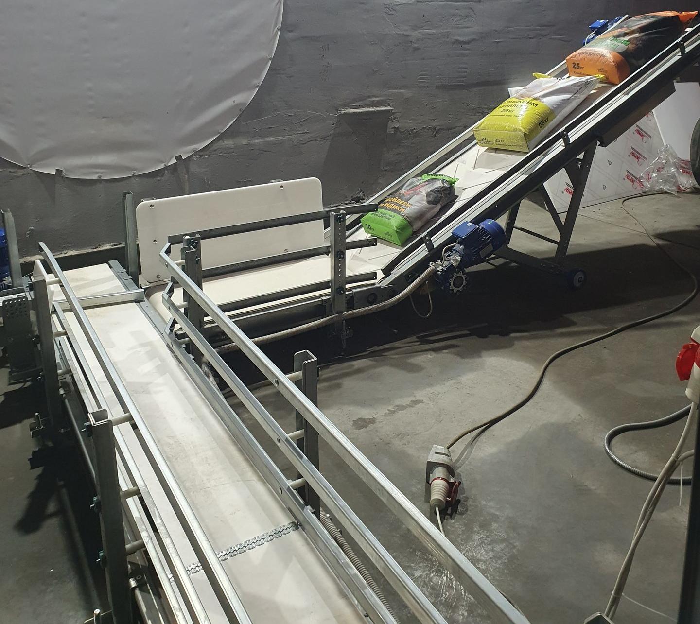 Система підйомних конвеєрів для автоматичної подачі мішків на палетайзер з віддаленим регулюванням по висоті.