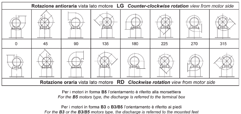 Вихід спіральних корпусів зі сталевого листа, звареного точковим зварюванням, оснащений приєднувальними фланцями. Спеціальні монтажні отвори дозволяють орієнтувати напрямок виходу повітря з кроком 45° шляхом повороту корпусу за годинниковою стрілкою (RD) або проти годинникової стрілки (LG).
