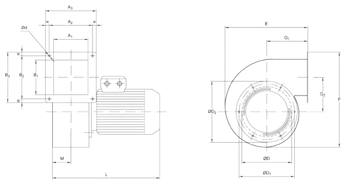 Вентилятори комплектуються асинхронними електродвигунами, однофазними або трифазними, з 2 або 4 полюсами, виконання B5, самовентильованими, розрахованими на безперервний режим роботи та такими, що відповідають стандартам UNEL та IEC.