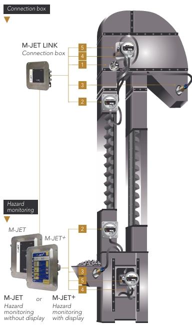 Пристрої моніторингу небезпек здатні контролювати роботу відерних підйомників, стрічкових, ланцюгових і гвинтових конвеєрів. Наша система моніторингу небезпек аналізує дані, які надсилають датчики, встановлені на обладнанні, і фіксує можливі дефекти. В залежності від налаштувань, M-JET+ або M-JET надсилає сигнали тривоги та керує зупинкою конвеєра.