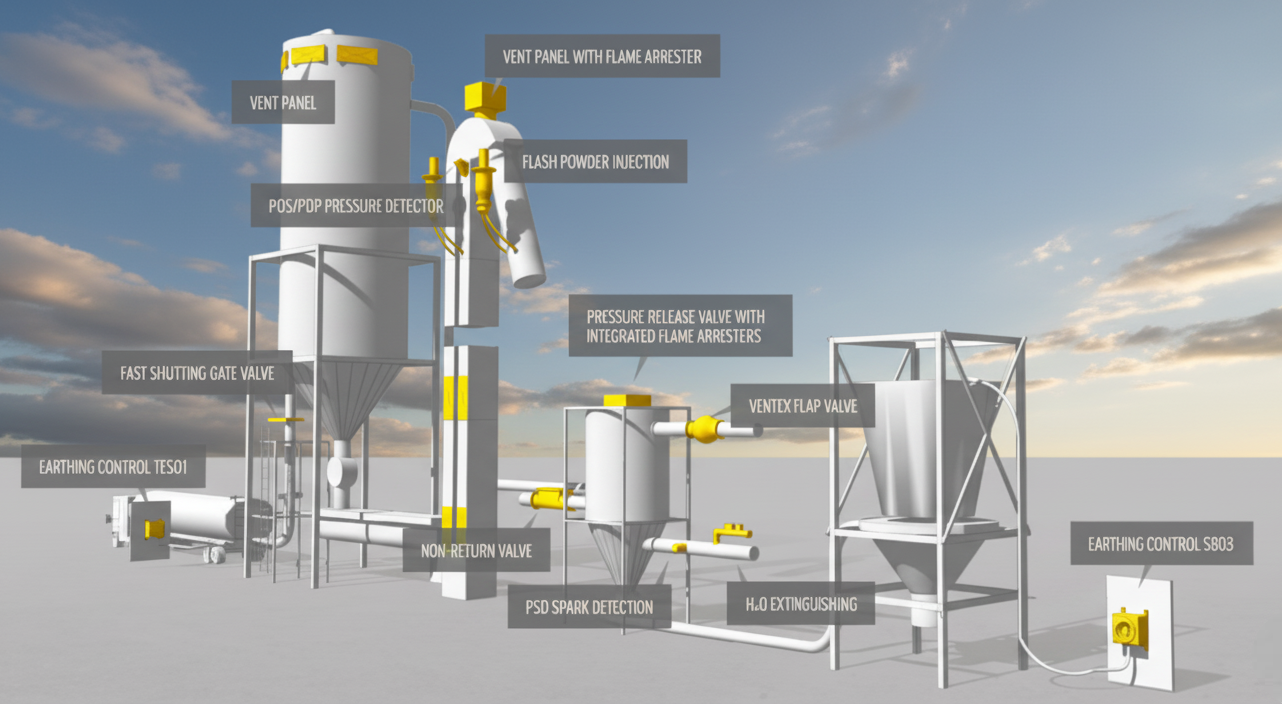 Системи подавлення вибухів (Flash™): швидко придушують пило-газові вибухи, інжектуючи спеціальний порошок на початковій стадії, мінімізуючи можливі пошкодження обладнання.
