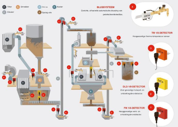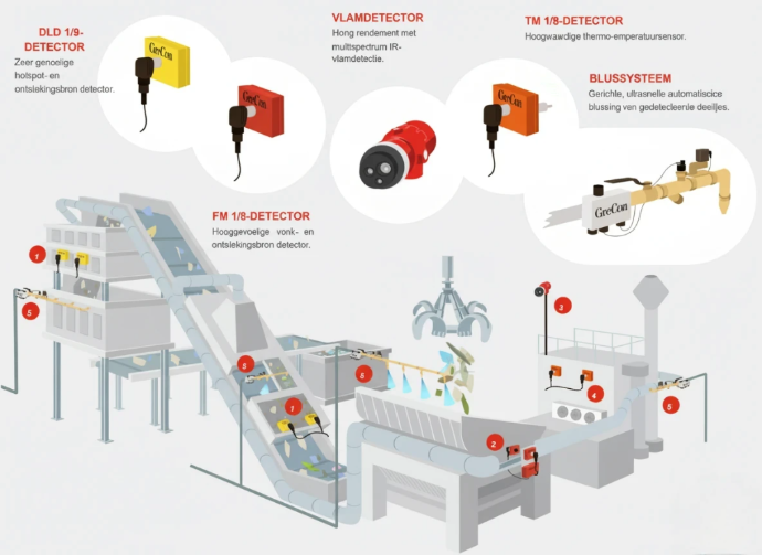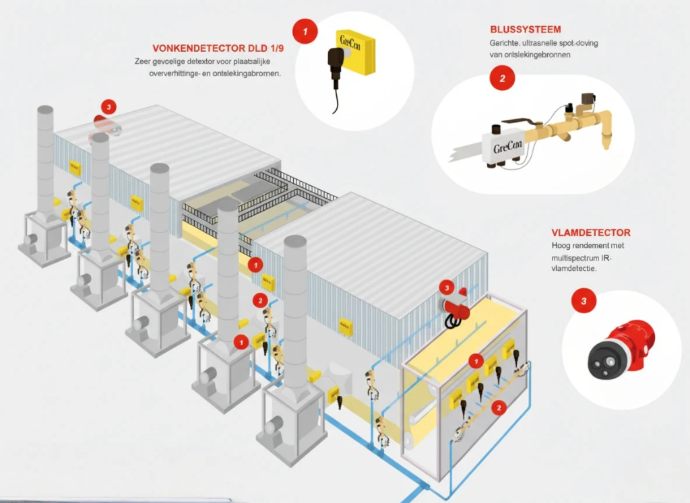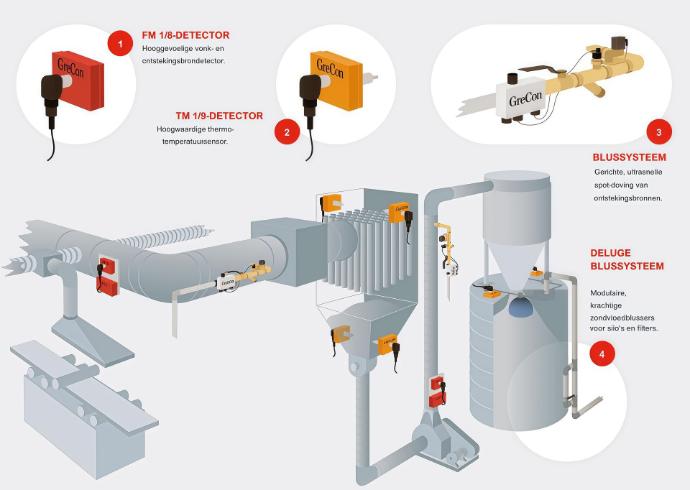 Система GreCon базується на виявленні частинок, що можуть спричинити займання — наприклад, іскр або гарячих чорних частинок у виробничих потоках. Виявлені частинки гаснуться за мілісекунди, ще до того, як вони можуть викликати пожежу або вибух пилу.