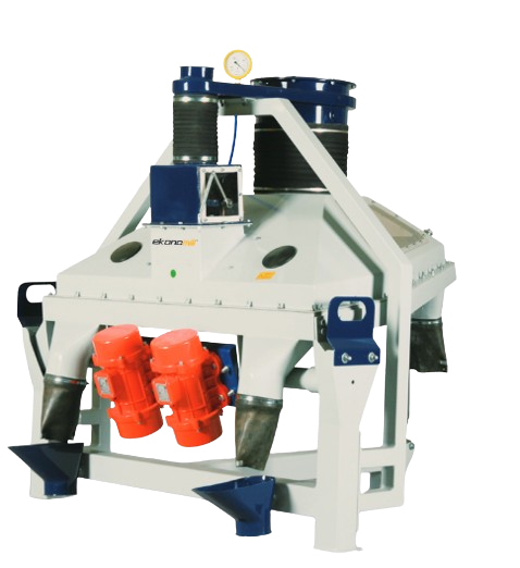 Камневідбірник EKOUTO призначений для очищення зерна від мінеральних домішок сухим способом. Застосовується для роботи в комплекті з іншими типами обладнання на зернопереробних підприємствах. Технологічний процес очищення зерна від мінеральних домішок відбувається в такий спосіб: через живитель приймача зерновий матеріал потрапляє на сітчасту поверхню розподілювача, продувну потоком повітря і коливальний рух під кутом до горизонтальної площині. Матеріал, що обробляється, приходить у псевдозріджений стан. Водночас частинки з великою придільною вагою опускаються на поверхню деки, а легкі — спливають.