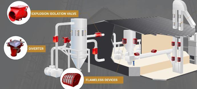 Для зменшення ризиків використовуються системи захисту від вибухів, які виводять тиск і пил, забезпечуючи безпеку персоналу та обладнання.